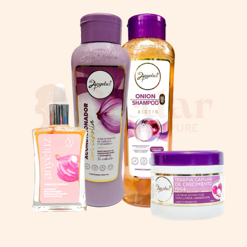 El Shampoo Con Cebolla (Salt and paraben free) of our Anyeluz brand is mainly composed of red onion, which contains quercetin (natural pigments with powerful antioxidants) that improves hair resistance, preventing breakage and flaking, its sulfur content stimulates blood flow and acts as an anti-inflammatory. The shampoo is salt-free and paraben-free, it cleanses the grease and reduces scalp irritations by activating the blood flow, making the hair follicle open and initiating a healthy and strong growth, it also provides shine and is suitable for all hair types (including children), you can use it every time you want to wash your hair.